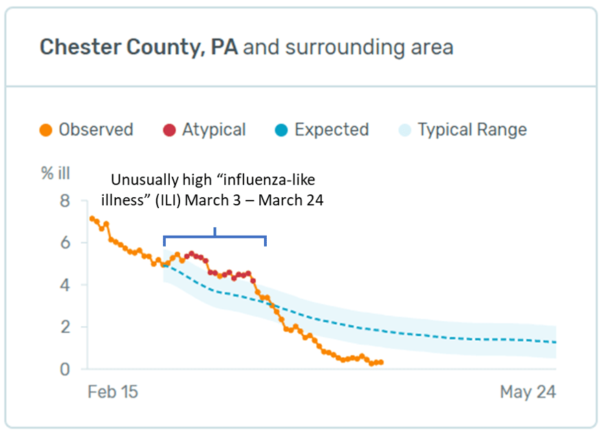 Note that the chart title says “Chester County, PA and surrounding area”. On their FAQ page, Kinsa says: “…residents of nearby counties regularly mix and share illness exposures. We also factor in information from neighboring counties in our estimate of illness levels…. It’s probably best to think of our illness signal as representing a geographic area centered around a particular county, rather than a single county exclusively.” But the Kinsa data probably provides a good indication of what’s happening here.