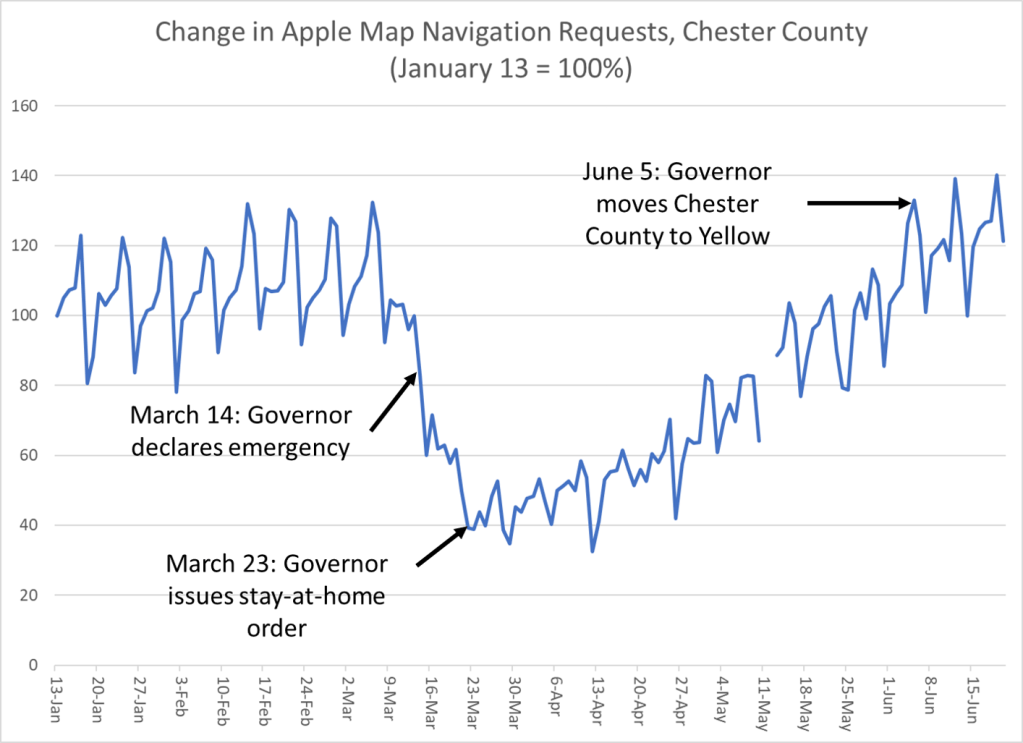 Governor Wolf is planning to move Chester County to Green status on June 26, but county residents are already back to making their usual number of trips, judging by their requests for directions from Apple.
