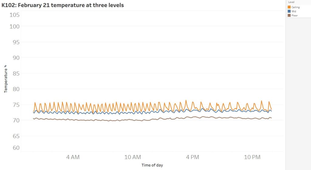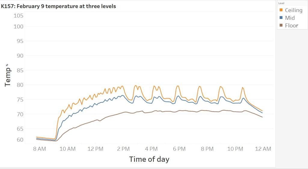 Here’s a graph of the ceiling, floor, and mid-level temperature at the Robertson’s cottage, #172, on December 12, 2020 (overnight low: 37°; afternoon high 62°).