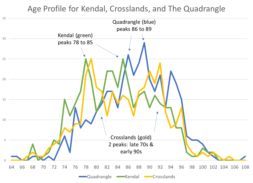 The details of the age profile for Kendal, Crosslands, and The Quadrangle are shown below. Each has a different age pattern for the resident population. For Kendal, the peak population is 85 and under. For The Quadrangle, the greatest numbers are in their late 80s. And Crosslands has two distinct peaks.