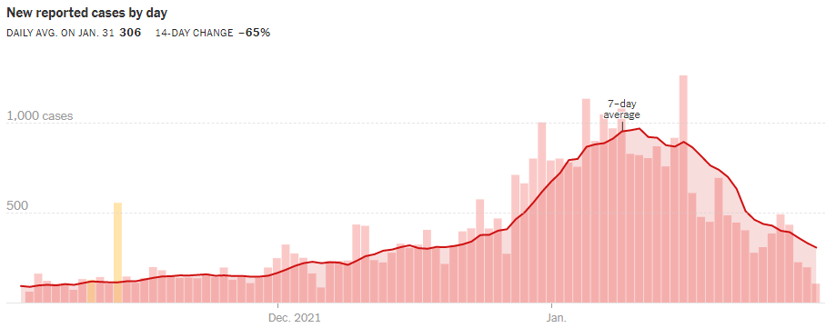 It’s been a tough two months on the Covid front, but things are clearly getting much better. The number of new cases per day in Chester County (as reported in the New York Times) peaked at over 1,000 on several days in the first half of January. By contrast, the number of new cases over the last three days (January 29, 30, and 31) are just 224, 196, and 105 respectively. Those are levels we haven’t seen since before Thanksgiving.