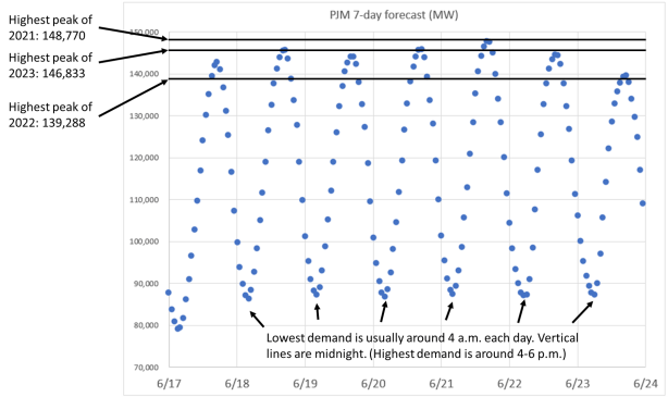 Our Energy Committee uses that information, plus the 7-day demand forecast that PJM posts every day, to determine when to call a “peak alert”. Jim Craig, Gary Johnson, and I do that work. We are assisted by Joel Brody, a resident at Collington (a Kendal CCRC in Maryland) where there is a parallel program.
