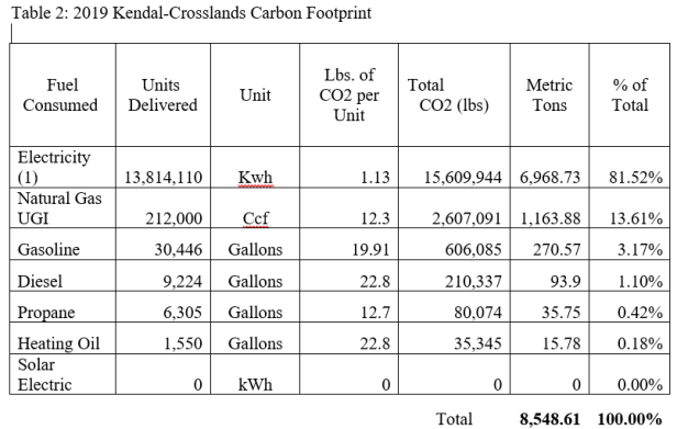 It is important to measure the progress toward the Paris goals.  A Carbon Footprint Study was conducted by reviewing billing and delivery data from 2023 for Kendal-Crosslands Community (KCC).  The results are shown in Table 1, which show the metric tons of CO2 emissions from diesel, gasoline, propane, natural gas and electricity used at the KAL and Crosslands during 2023.  A total of 5590 metric tons of CO2 emissions were shown, with 75% from electricity use, and 20% from natural gas.