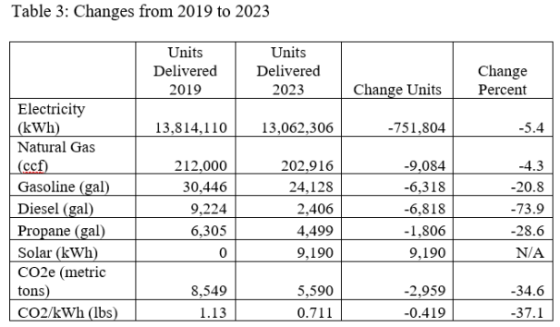 A detailed comparison for each energy source is shown in Table 3.  For example, it shows there was a 5% reduction in use of electricity during the period.  Natural gas declined by 4%, while gasoline, diesel and propane declined more than 20%.   Solar energy production at Crosslands was installed in 2023 and produced over nine thousand kWh from September 14, 2023 to December 31, 2023.  This and future installations of solar will allow KCC to reduce purchases from the PA grid and lower CO2 emissions.