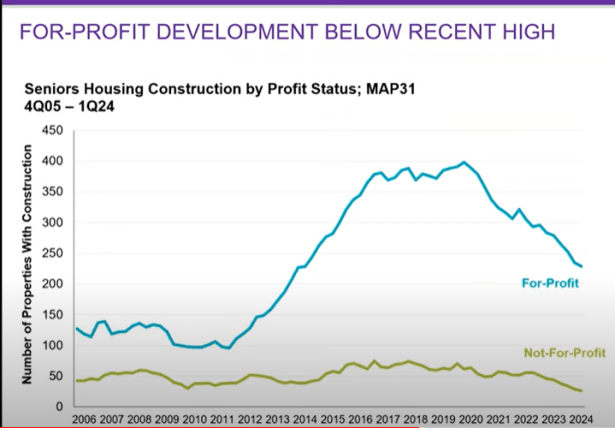 Growth. Castleberry then turned to the growth of the senior housing industry. The industry is growing, but not nearly as fast as it was prior to Covid. The growth of the for-profit part of the industry, in particular, has slowed down a lot. That is illustrated in the following slide from Castleberry’s presentation.