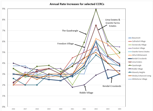 I was startled to see the wide range of rate increases. In 2023, the lowest increase (2.9%) was for Riddle Village and the highest (9%) was for both The Quadrangle and Freedom Village. Since then, the range is less, but it is still striking. For 2025, the lowest is 3% (KCC and Wesley Enhanced Living) and the highest is 5.5% (Freedom Village).