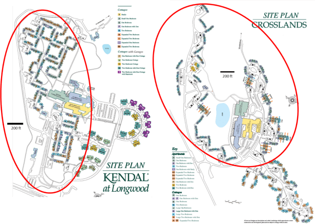 Although Kendal and Crosslands are similar communities in many respects, the differences in topography and layout have caused subtle differences in the lives of residents that the founders probably did not anticipate. Those differences, especially as they affect independent-living (IL) residents are the subject of this post. In what follows, I will not discuss the impact of later campus expansions (the “400s” at Crosslands and the “Kendal East” duplexes). These expansions have changed the character of each campus somewhat, but I believe the general description below is still mostly accurate.