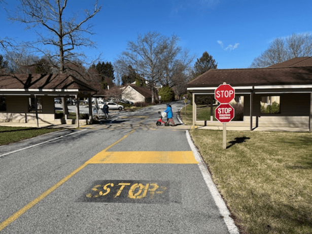 For a majority of Crosslands residents, getting to the Center on foot requires crossing the road, and the road crossings are not protected from the elements.